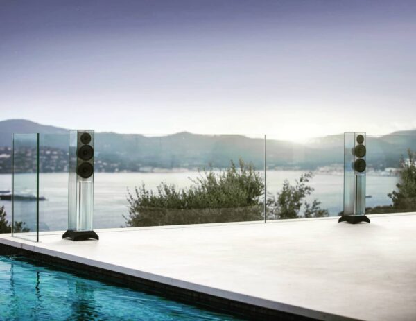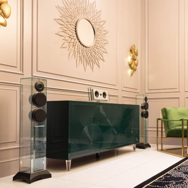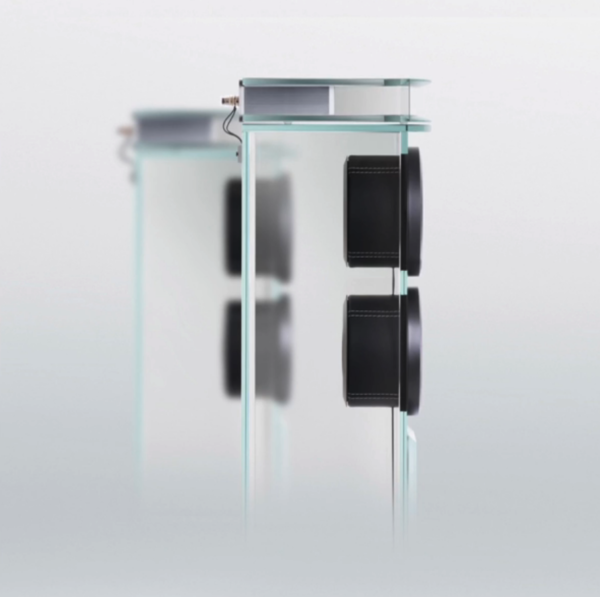 El vidrio de seguridad de 10 mm es grueso, pesado y sólido, pero a la vez bellamente transparente, con un ligero tono verdoso donde se encuentran los bordes. El acabado Platinum glass, un tratamiento moderno que combina vidrio y platino añade claridad y elegancia, permitiendo ver dentro y a través del altavoz y dando la ilusión de que los drivers flotan en el espacio, con el cableado interno perfectamente trazado de forma simétrica desde los paneles frontal y trasero.