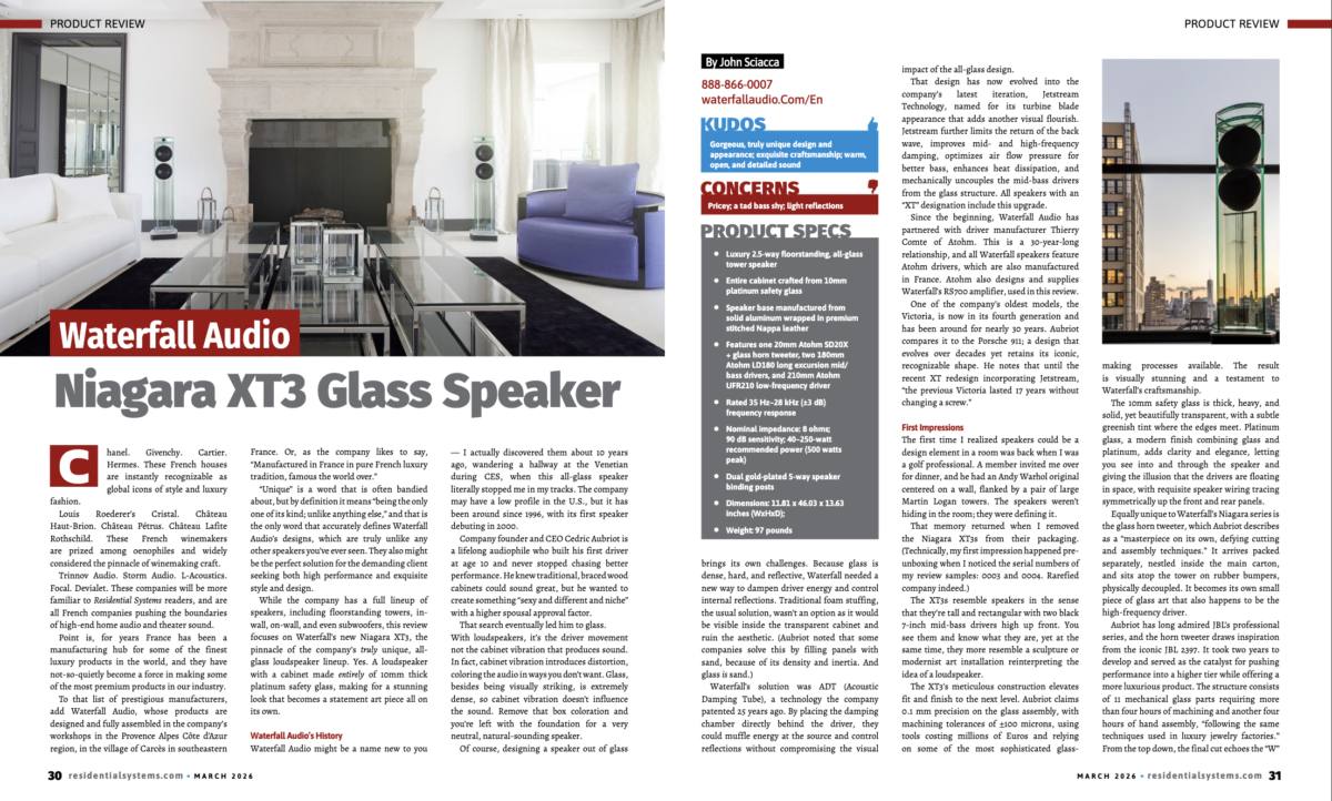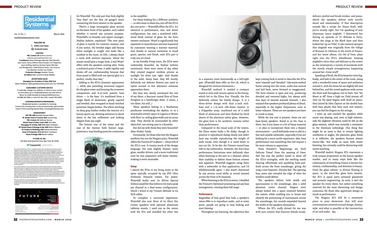 Aunque la empresa dispone de una línea completa de altavoces —incluyendo torres de suelo, modelos para pared, empotrables y subwoofers— esta reseña se centra en el Niagara XT3, el buque insignia de la exclusiva línea de altavoces totalmente de vidrio de Waterfall. Como altavoz de la gama más alta de la compañía, el Niagara XT3 cuenta con un gabinete fabricado completamente con vidrio de seguridad de platino de 10 mm, lo que crea un aspecto espectacular que se convierte en una auténtica pieza de diseño dentro del hogar.